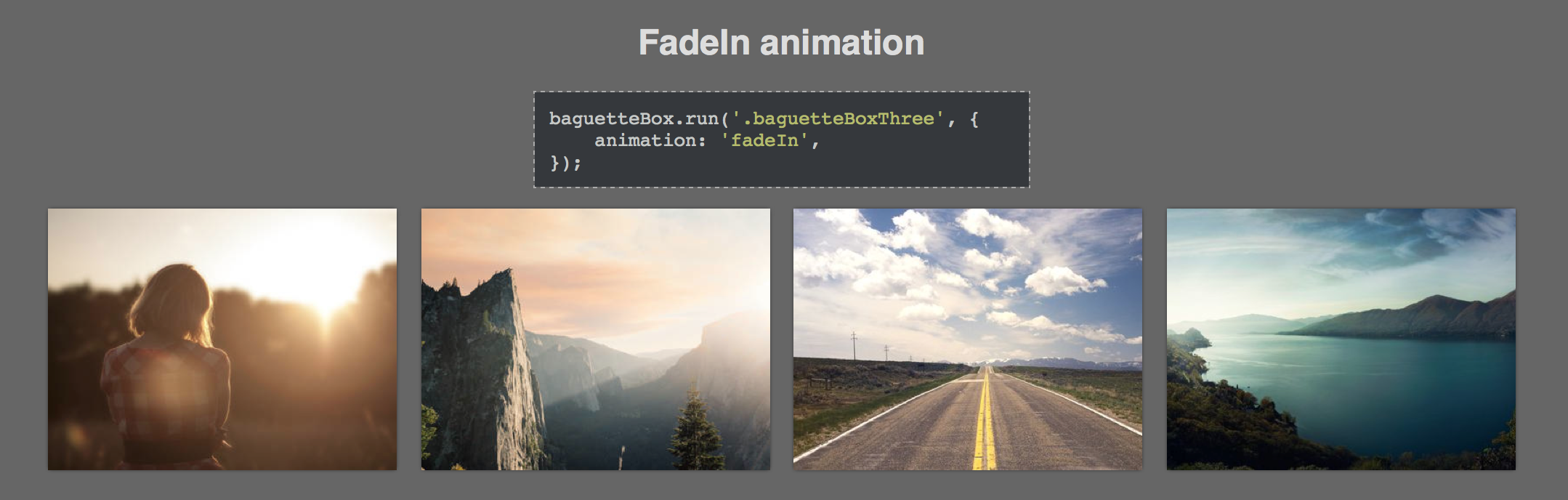 baguetteBox.run('.gallery');where the first argument is a selector to a gallery (or galleries) containing a tags. The HTML code may look like this: