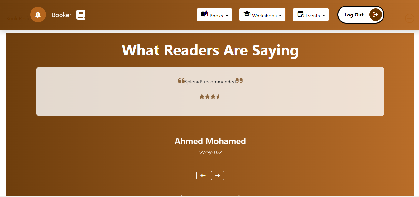 Booker is a web application that serves as a library management system; allowing its users to interact with a library by borrowing/purchasing books, enrolling in workshops, participating in signing events, and reviewing any entity of interest. Scrrenshots of different webpages are shown below.
