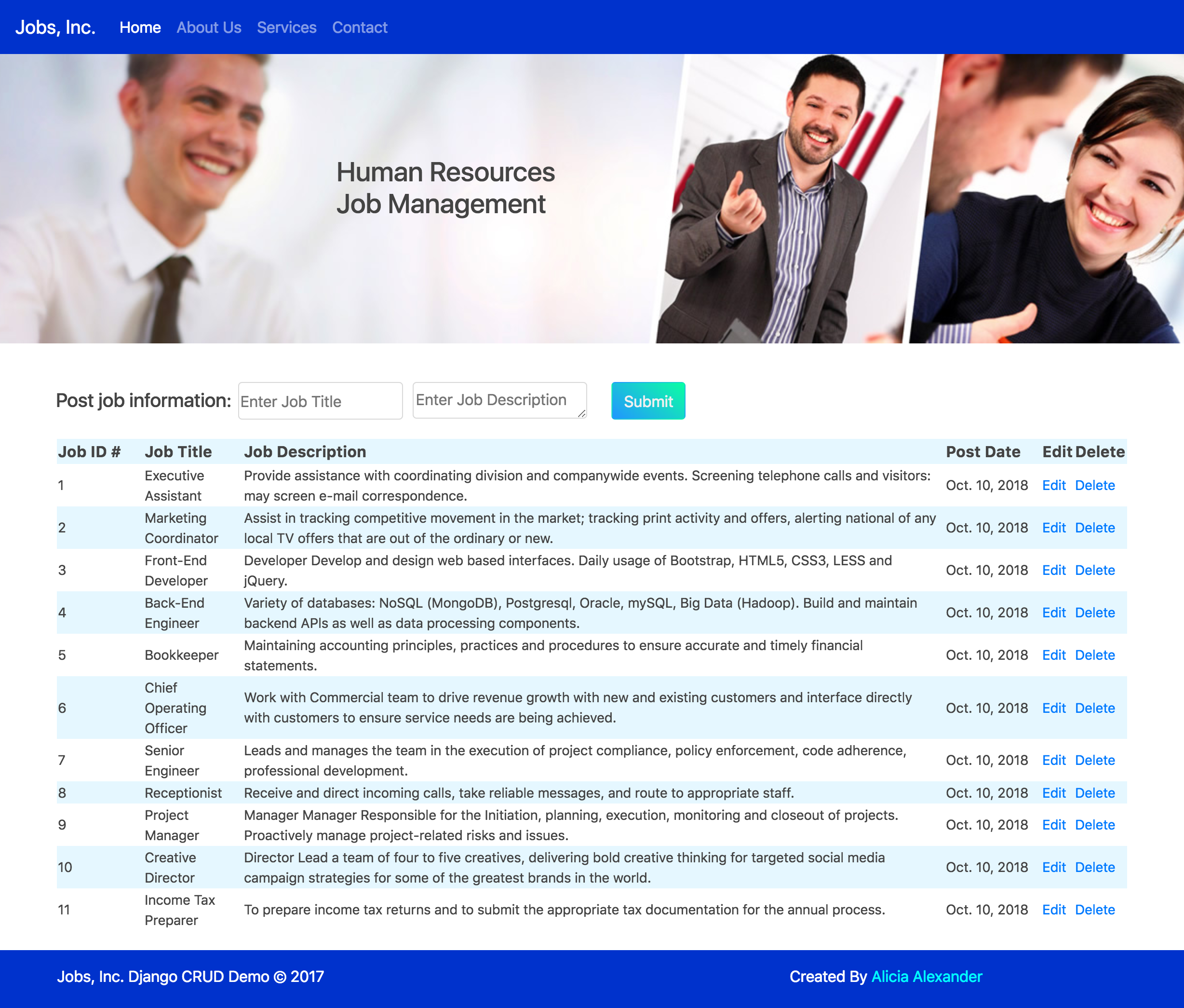 This is a DJANGO human resources job post management app tool that allows users to post, edit and delete job titles and descriptions. It's the basic CRUD (create, read, update and delete).