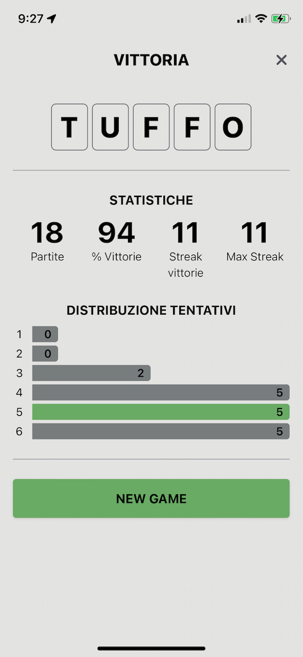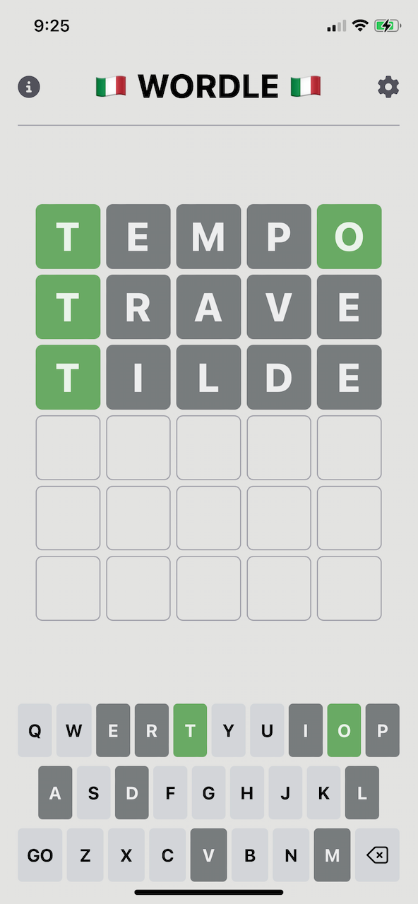 Unofficial Italian fan-made version of Wordle. This version stays true to the original’s word puzzle mechanics, offering endless gameplay with over 3,000 words to guess, the ability to track your stats, and detailed performance insights. Play without limits, challenge your vocabulary, and improve your skills with every guess, all in Italian!