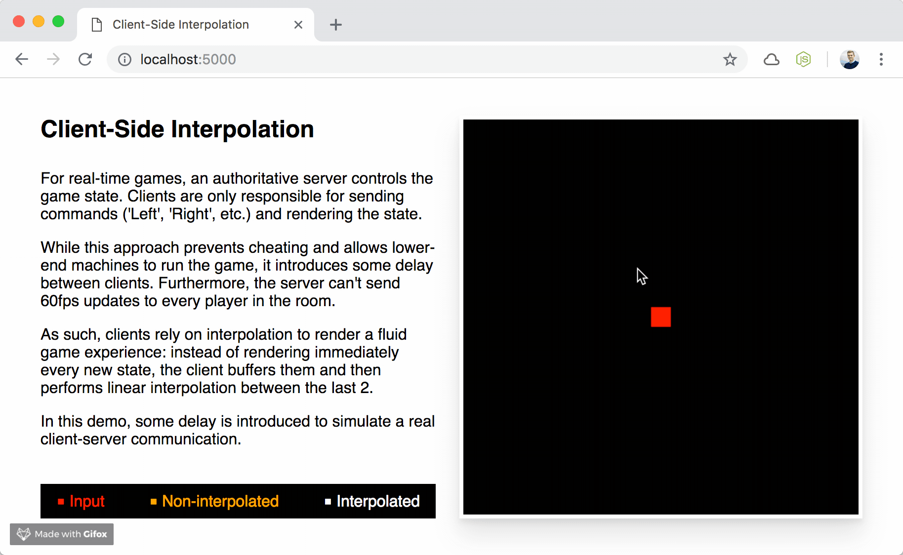 While this approach prevents cheating and allows lower-end machines to run the game, it introduces some delay between clients. Furthermore, the server can't send 60fps updates to every player in the room.