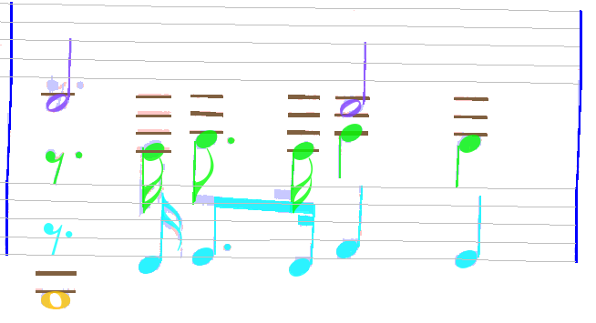 2/ What appears to be more difficult is the voices assignment. Current OMR engine assumes that all chords connected via the same beam group belong to the same voice. In the measure at hand, we have one beam group. Even with manual adjustments, the best configuration I was able to obtain is as depicted below: