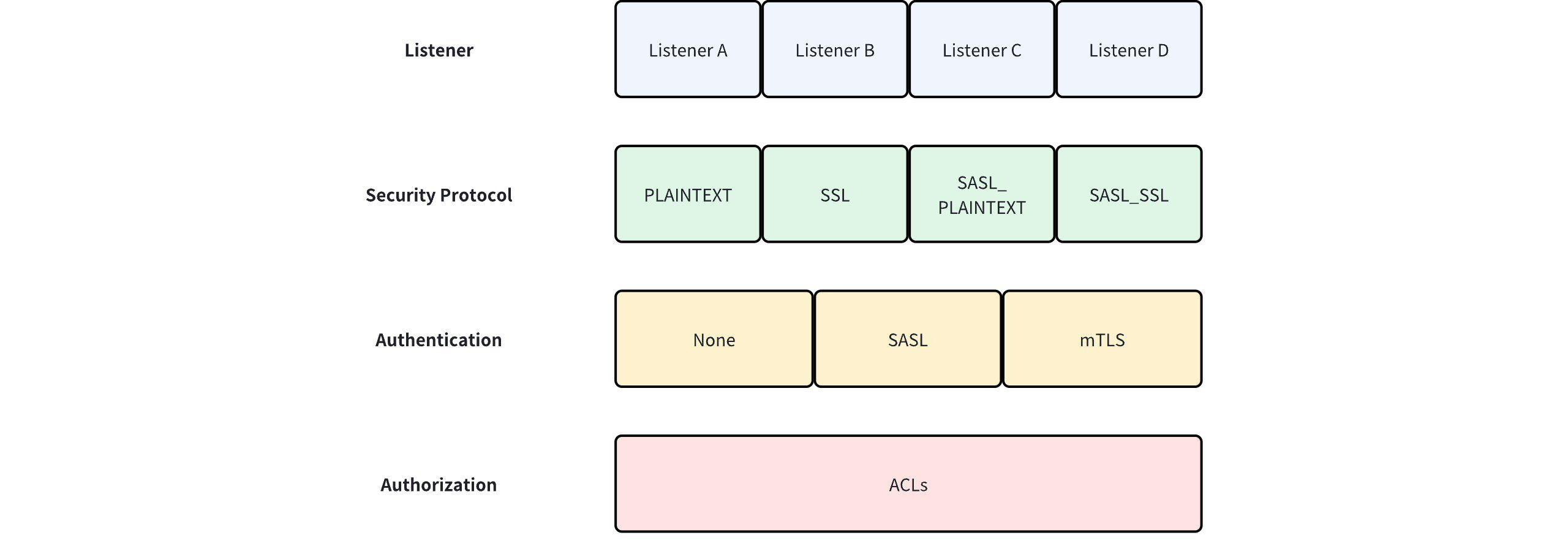 We can map listener names to security protocols. For instance, Kafka supports the following security protocols: