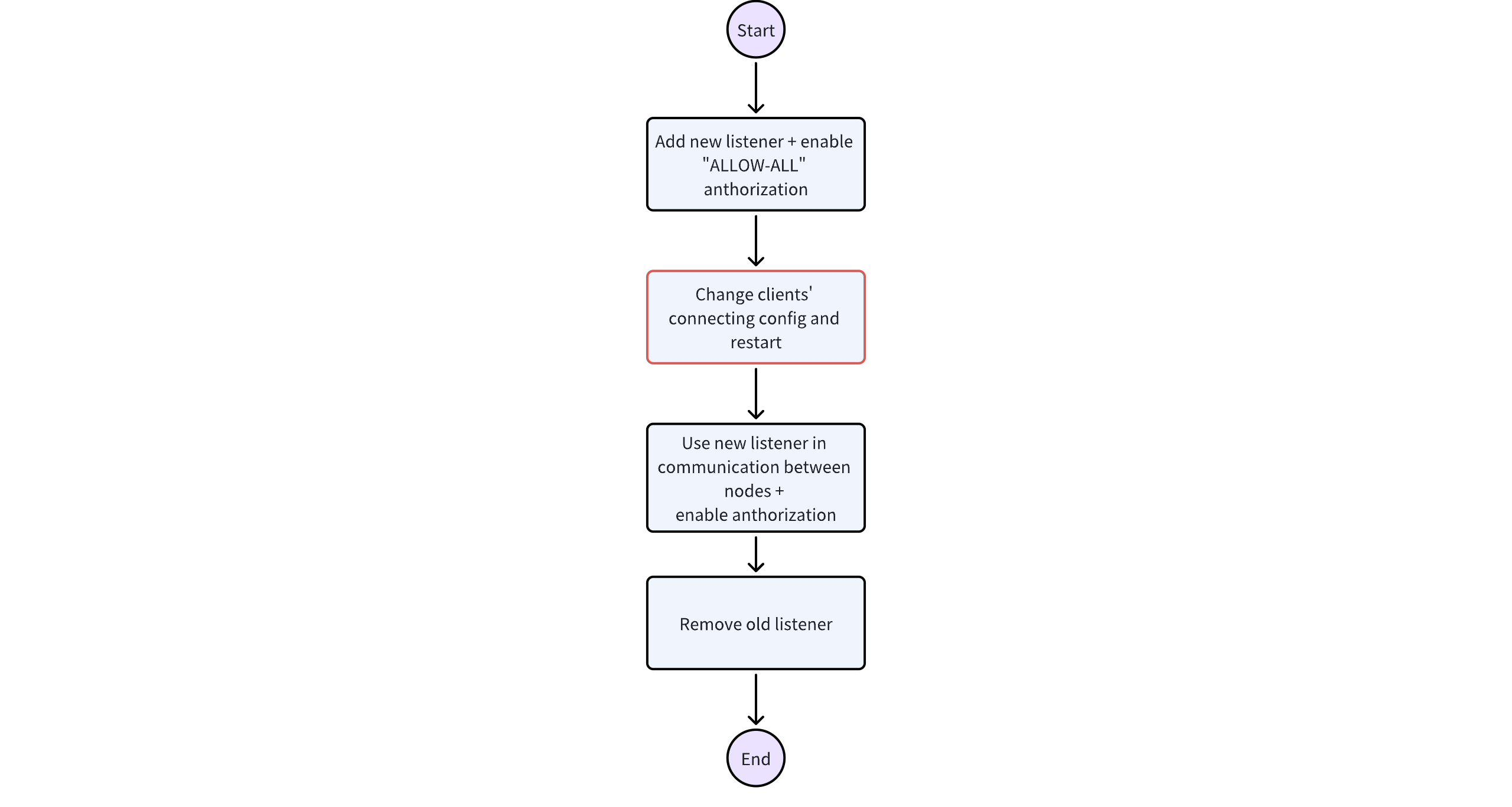 In certain situations, it is necessary to consider switching security protocols or enabling authentication for clusters that previously did not use authentication. For example, in a development environment, we typically use the default PLAINTEXT configuration for the cluster. If the unfortunate scenario arises where the PLAINTEXT protocol is used in testing or production environments, then upgrading the security protocol and enabling authorization becomes necessary.