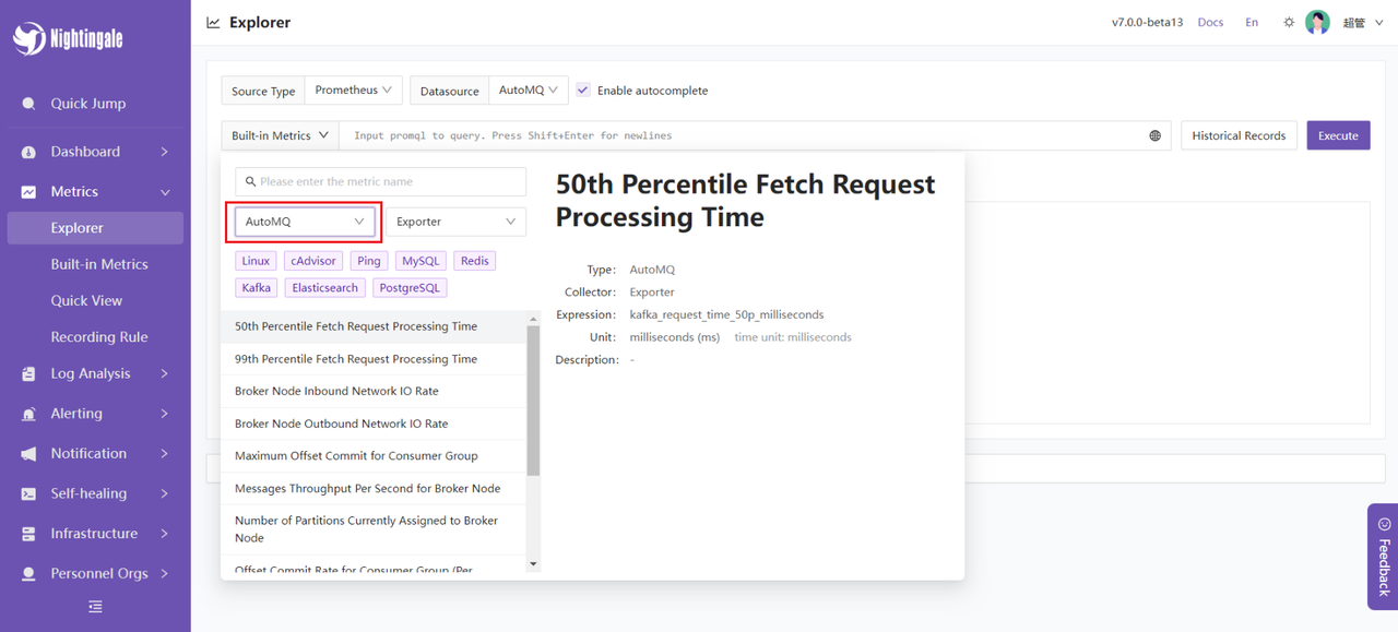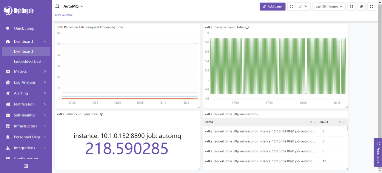 In modern enterprises, as data processing demands continue to grow, [AutoMQ][1] has become a critical component for real-time data processing due to its efficiency and low cost. However, with the expansion of cluster scale and increasing business complexity, ensuring the stability, high availability, and performance optimization of AutoMQ clusters becomes particularly important. Therefore, integrating a powerful and comprehensive monitoring system is essential for maintaining the healthy operation of AutoMQ clusters. The [Nightingale monitoring system][2] is an ideal choice for enterprises to monitor AutoMQ clusters due to its efficient data collection, flexible alert management, and rich visualization capabilities. By utilizing the Nightingale monitoring system, enterprises can grasp the operational status of AutoMQ clusters in real time, promptly identify and resolve potential issues, optimize system performance, and ensure business continuity and stability.