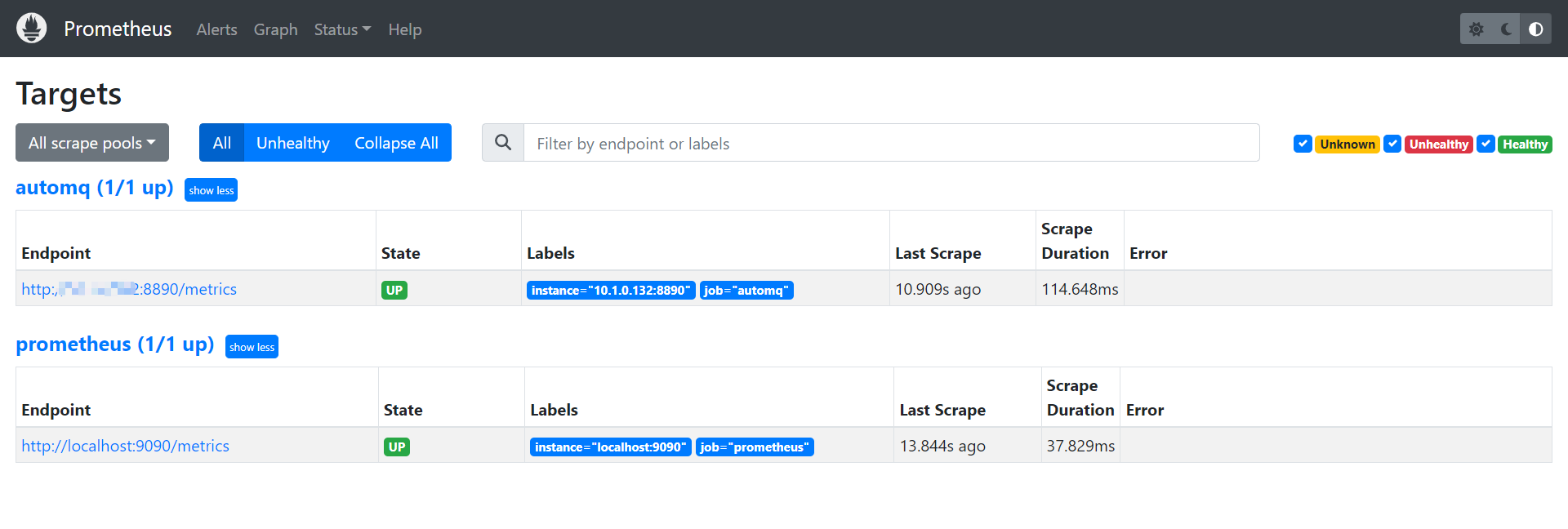 After deployment, you can access Prometheus through a browser to check if it has successfully collected metrics data from AutoMQ by visiting `http://{client_ip}:9090/targets`: