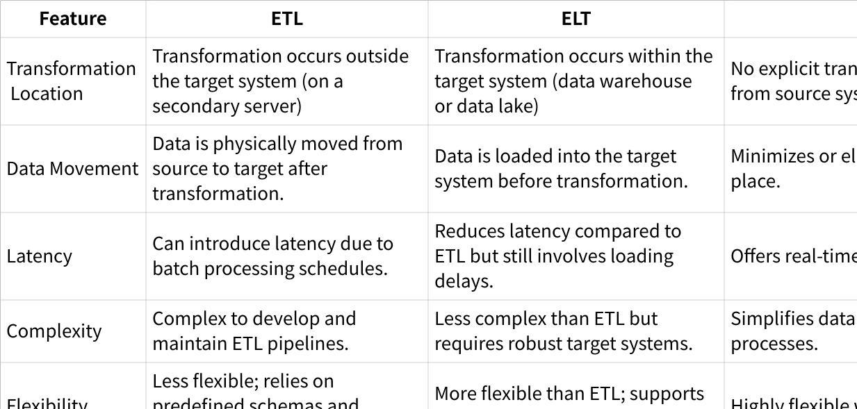 ELT (Extract, Load, Transform) : A variation of ETL where data is extracted, loaded into a target system, and then transformed within that system. This approach leverages the processing power of modern data platforms.