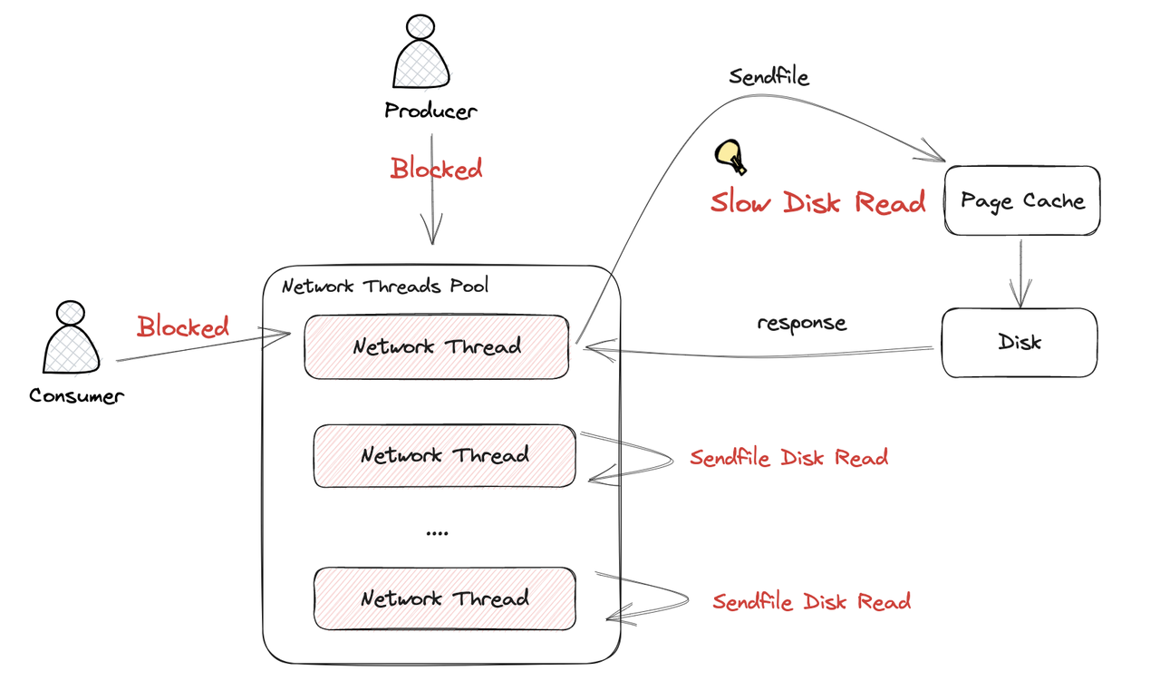 But if a cold read occurs, when the Kafka network thread writes data to the network kernel's send buffer, the sendfile call needs to first load the disk into Page Cache, and then write to the network kernel's send buffer. In this zero-copy process, the process of the Linux kernel loading data from the disk to Page Cache is a synchronous system call, so the network thread can only synchronously wait for its associated data to finish loading data from the disk before it can continue to handle other work.