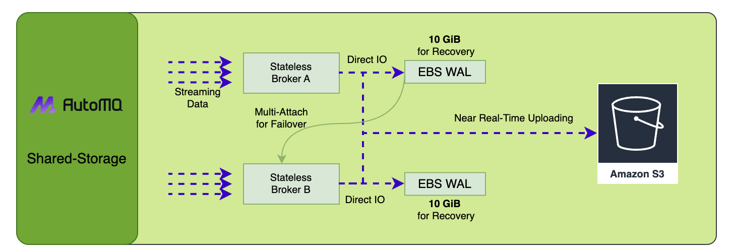 If one does not understand the advantages of our storage architecture, it's easy to confuse this innovative shared storage architecture with Tiered Storage. In tiered storage, the Broker is essentially a stateful Broker, tightly coupled with local disks. In our Shared Storage architecture, Brokers are decoupled from EBS. When a compute node crashes, using EBS multi-attach capabilities11 and NVME reservations12, failover and recovery can be completed in milliseconds. AutoMQ's Shared Storage architecture treats EBS as shared storage. EBS volumes can be quickly mounted to other nodes in the event of an EC2 failure, continuing to provide read and write services seamlessly. From this perspective, EBS is considered shared storage, similar to S3, rather than a stateful local disk. For EBS, being completely decoupled from Brokers, the Brokers in AutoMQ are stateless. EBS and S3 are both cloud-provided storage services, and by fully leveraging the features of cloud storage, we can seamlessly share EBS volumes among Brokers, forming our innovative Shared Storage architecture.