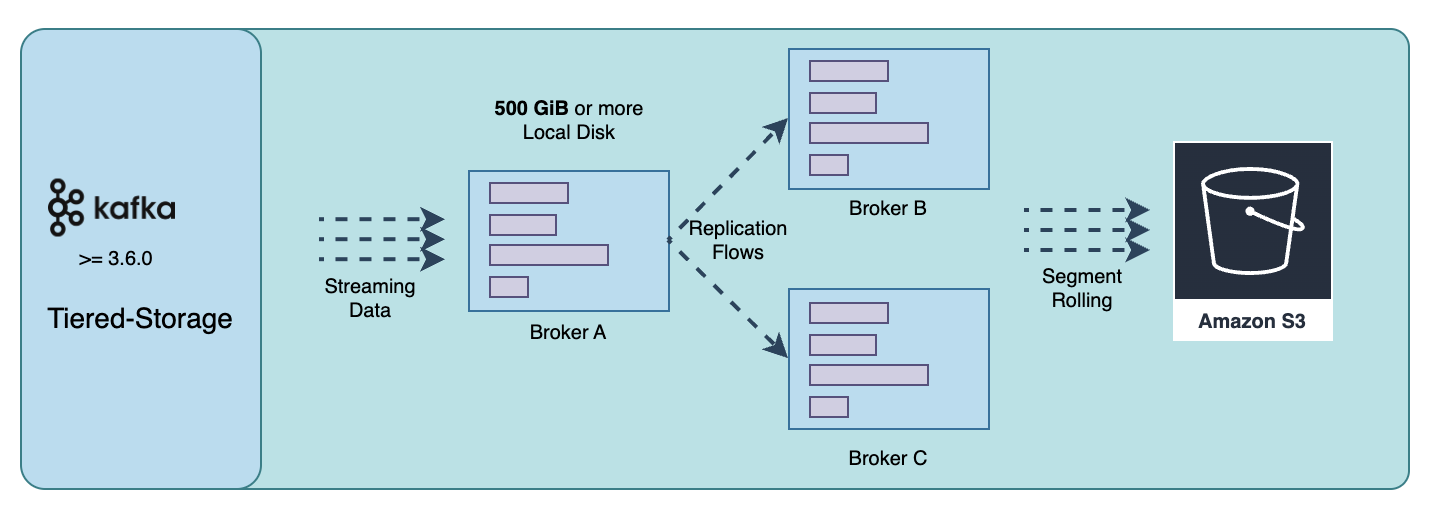 Network traffic cost issues across multiple AZs: The essence of Tiered Storage is still based on Kafka's local storage logs, and the relationship between brokers and local disks has not changed. By moving some historical data to S3, it reduces costs and the volume of partition data replication, but it is still a superficial solution. Kafka's implementation of tiered storage requires that the last log segment of a partition must still be on a local disk, meaning brokers in a tiered storage scenario remain stateful. When the last log segment of a partition is large, extensive partition data replication is still inevitable during horizontal scaling.