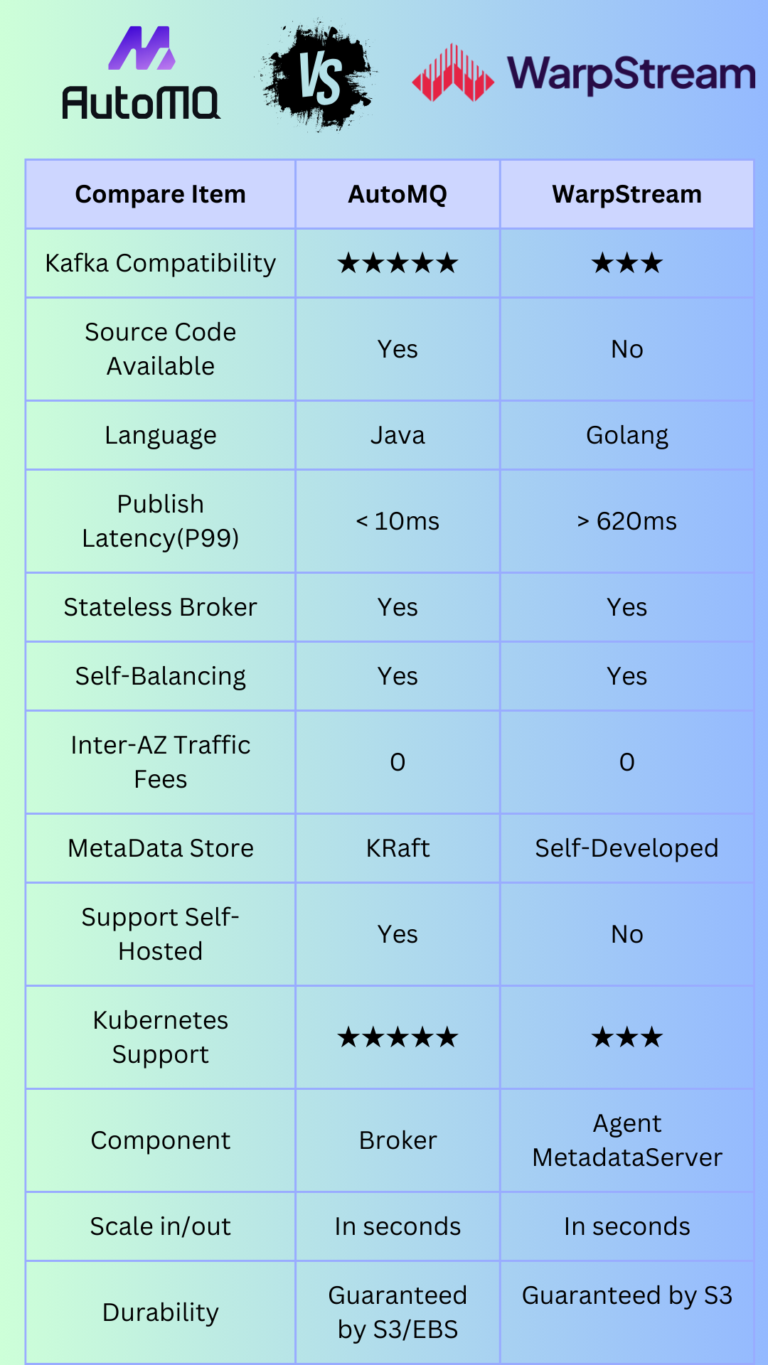 AutoMQ and WarpStream's differences can be summarized in the following figure. If you are interested in a detailed comparison, you can continue reading the subsequent content.