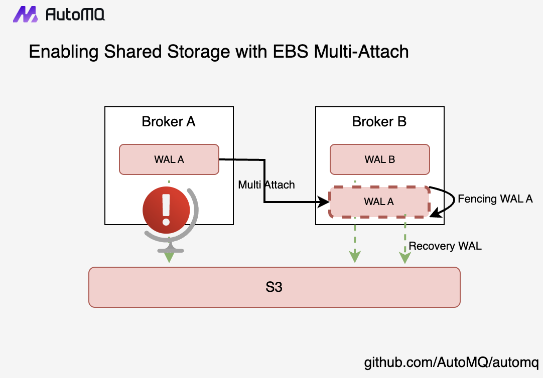 Storage Layer Implementation : WarpStream’s implementation is relatively straightforward. It employs an Agent to receive data from the Producer, which then writes the data to object storage. This approach only returns success to the Producer once the data is fully persisted in the object storage, before proceeding with subsequent data writes. The major drawback of this method is the loss of latency performance. WarpStream’s official evaluation shows a P99 latency of 620ms [10]. AutoMQ, on the other hand, ingeniously uses a small EBS volume (10GB) as a Write-Ahead Log (WAL), leveraging EBS’s low latency, high performance, and durability to ensure write performance. With EBS WAL, AutoMQ can provide single-digit millisecond P99 latency [11], making it significantly superior to WarpStream in terms of latency . Additionally, since EBS inherently ensures high durability through multiple replicas, AutoMQ does not need to use additional replicas like Apache Kafka, thereby saving 2/3 of the storage costs and completely avoiding data replication between Brokers. As shown in Figure [4], AutoMQ can achieve millisecond-level failover using NVME Reservation and multiple EBS volume mounts, effectively treating EBS as shared storage.