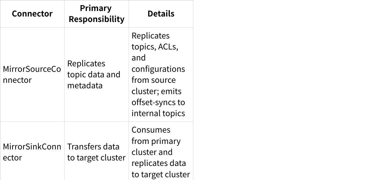 These connectors work together to create a comprehensive replication system that not only transfers data but also maintains configuration consistency and enables consumer migration between clusters.