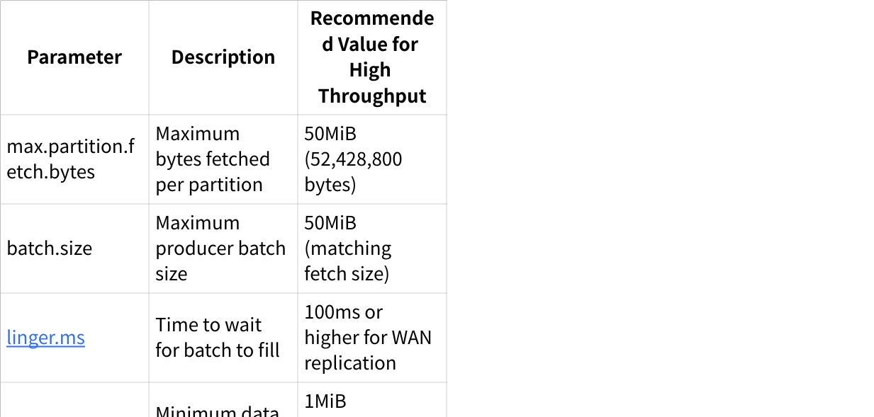 For replication across high-latency networks, larger batch sizes become essential. Research shows that with a 100ms round-trip time, small batches severely limit throughput. For optimal performance over WAN connections, batch sizes should be at least 32MiB.