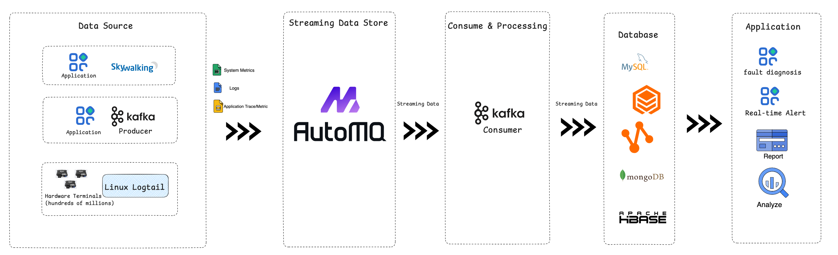 Thanks to AutoMQ's 100% compatibility with Apache Kafka, the entire migration process was very smooth. Components such as Skywalking and Logtail were fully compatible with AutoMQ after testing, requiring no modifications. After completing the PoC, we successfully migrated from Kafka to AutoMQ using a traffic-cutting approach.