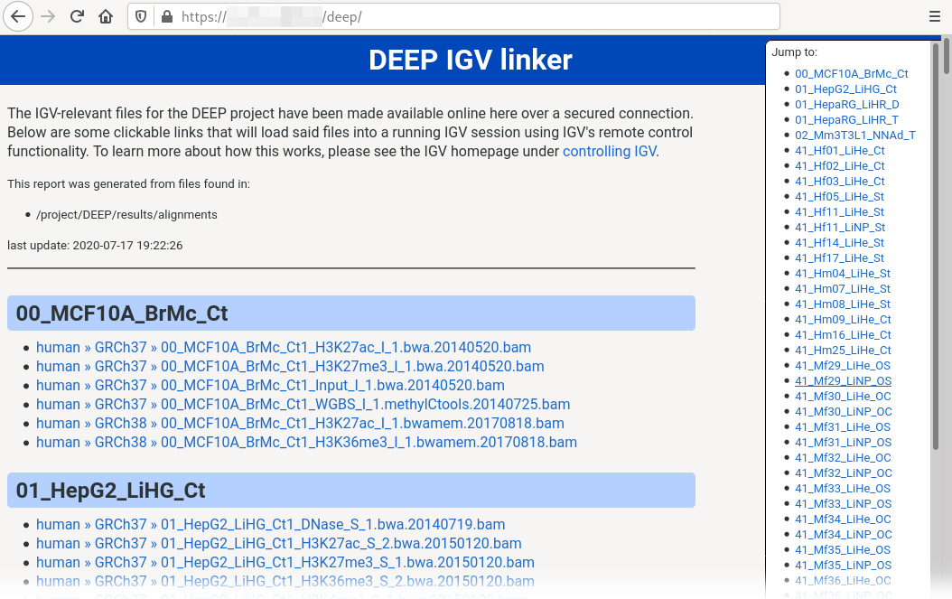 The crawler crawls filesystems for bioinformatics files that are viewable in IGV, grouping them by a user-definable regular expression. The results are displayed in a single HTML report for one-click access by using IGV's HTML remote control capabilities. Since IGV can open files from URLs, this gives you a sorted overview of your data that is magnitudes easier to navigate than the native file->open dialog.
