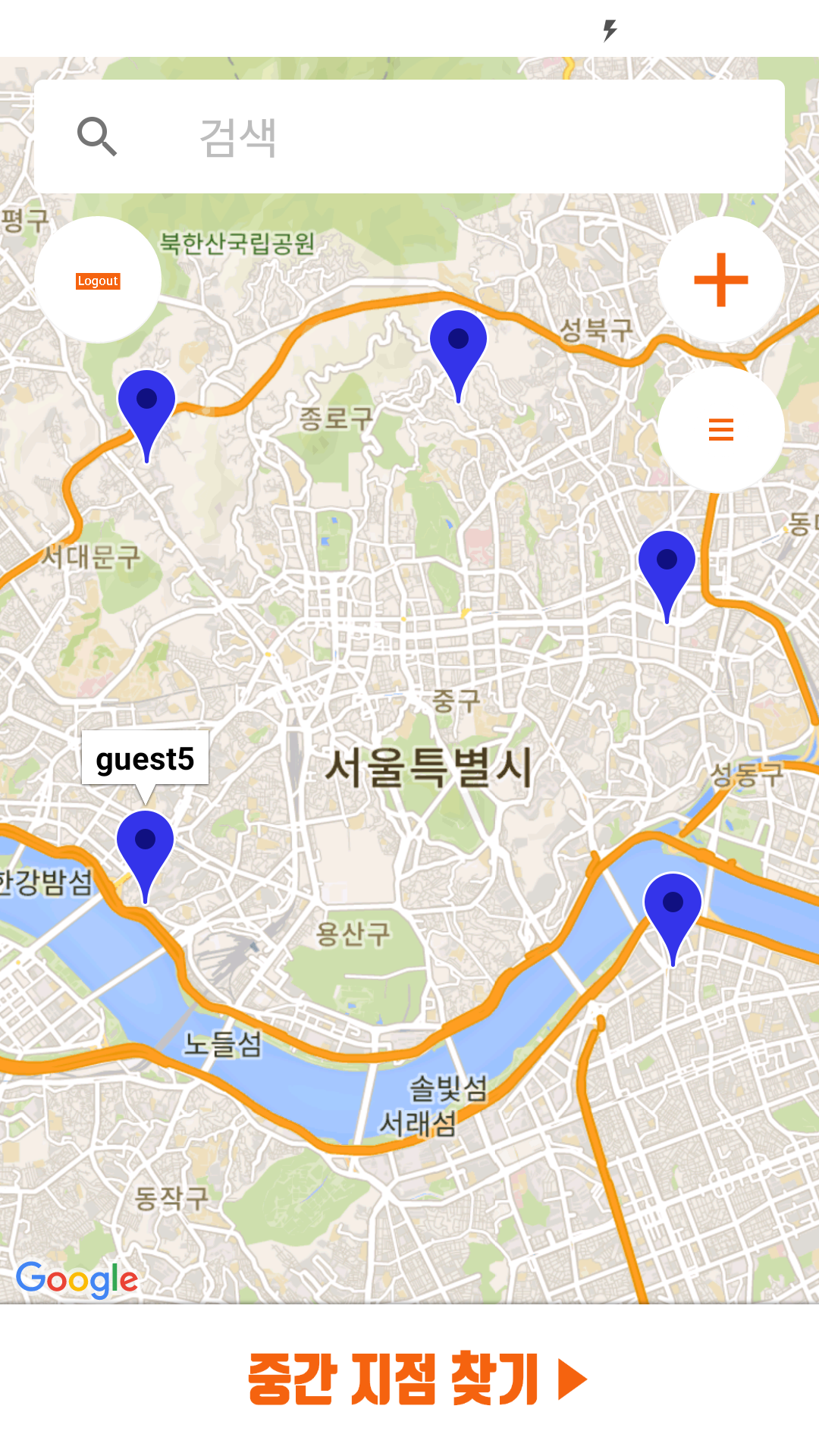 그러므로 우리는 대중교통 길 찾기 정보를 기반으로 하여, 중간지점 까지 사용자들이 이동하는 '시간'을 공평하게 만들어줄 최적의 중간지점 탐색 알고리즘을 자체 제작하여 사용자에게 추천해주는 앱을 구현하였다.