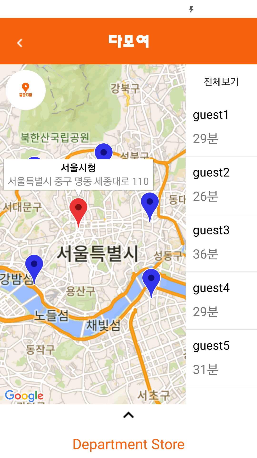 다모여 서비스의 성능을 테스트하기 위하여 유사 서비스의 중간지점 선정 방식과 비교하였고, 사용될 데이터는 구글 길찾기를 통해 직접 각 출발 위치에 대해서 최적 중간지점을 구하는 방식으로 테스트 데이터를 수집하였다. 중간지점의 적정성의 판단 기준은 최적 통행 비용을 가지는 경우와, 그렇지 않을 때 실험데이터의 중간지점의 위치에서 반경 500m안에 알고리즘의 중간지점이 존재하는 경우로 나누었다.