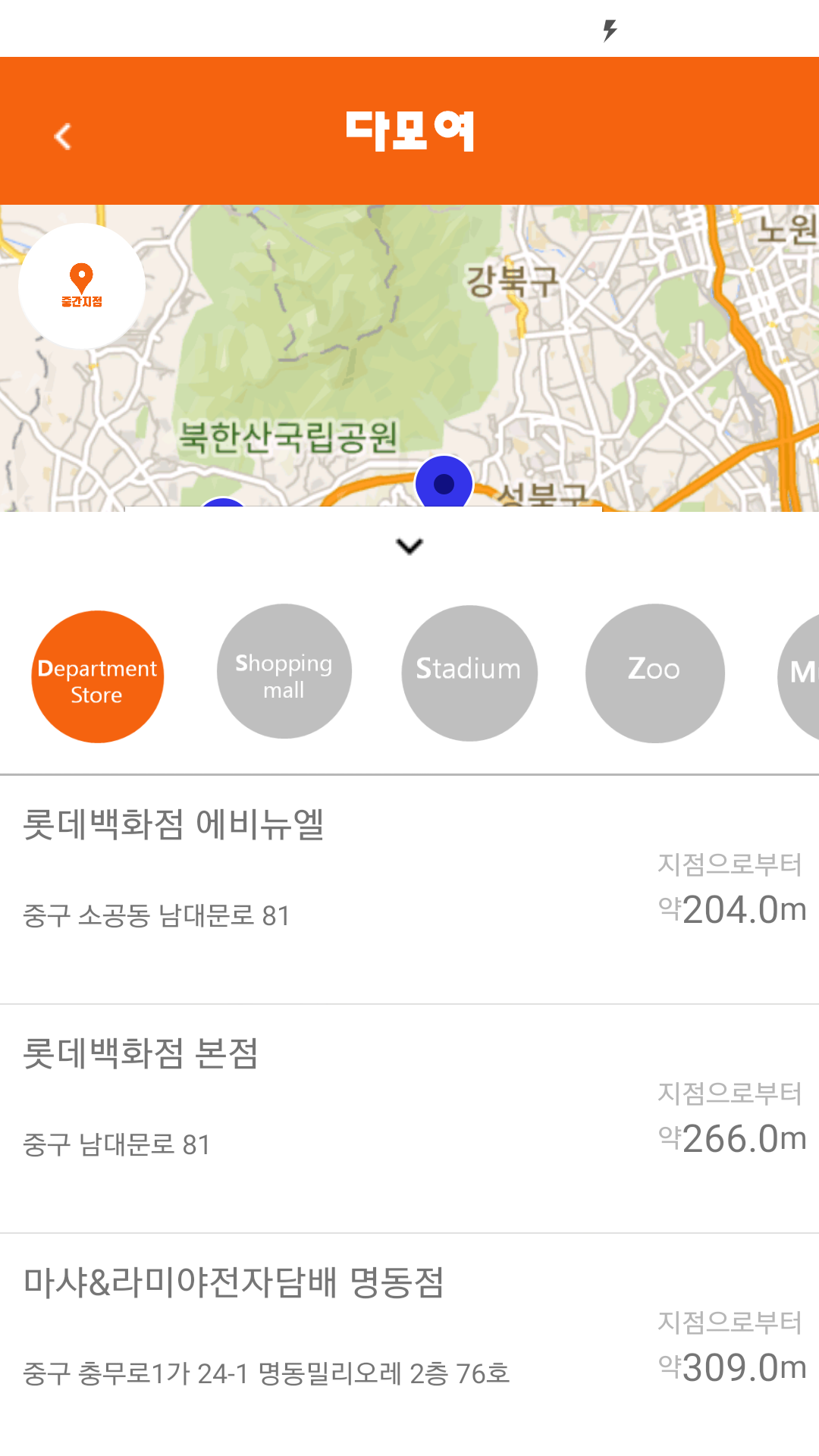 부가적으로 중간지점인근의 번화가를 추천해주는 랜드마크 기능을 제공하며, 중간지점과 랜드마크 지점 중 하나를 사용자가 선택하면 그 지점 인근의 만남 장소들을 카테고리 별로 분류하여 사용자에게 제공한다.