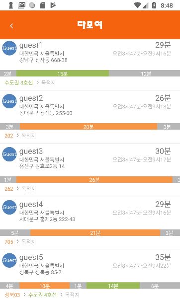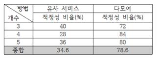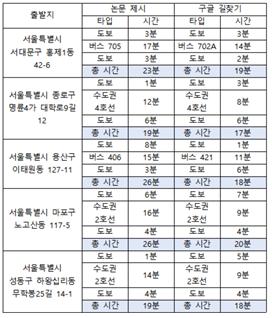 어플이 선정해준 중간지점과 테스트 데이터와 비교했을 때, 유사 서비스의 방식이 34.6%, 다모여가 78.6%로 48%의 차이를 보이며 매우 높은 중간지점을 추천해 주었다. 두번째 표를 보면 실제 중간지점이 선정 되었을 경우의 통행비용과 교통정보를 알 수 있다.