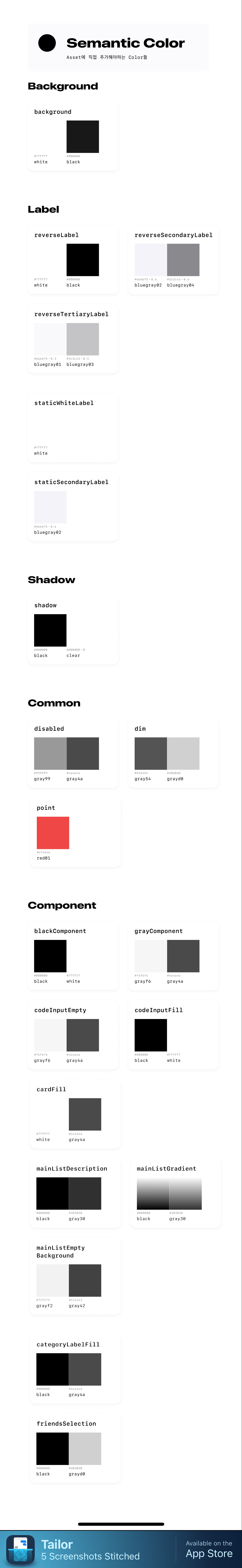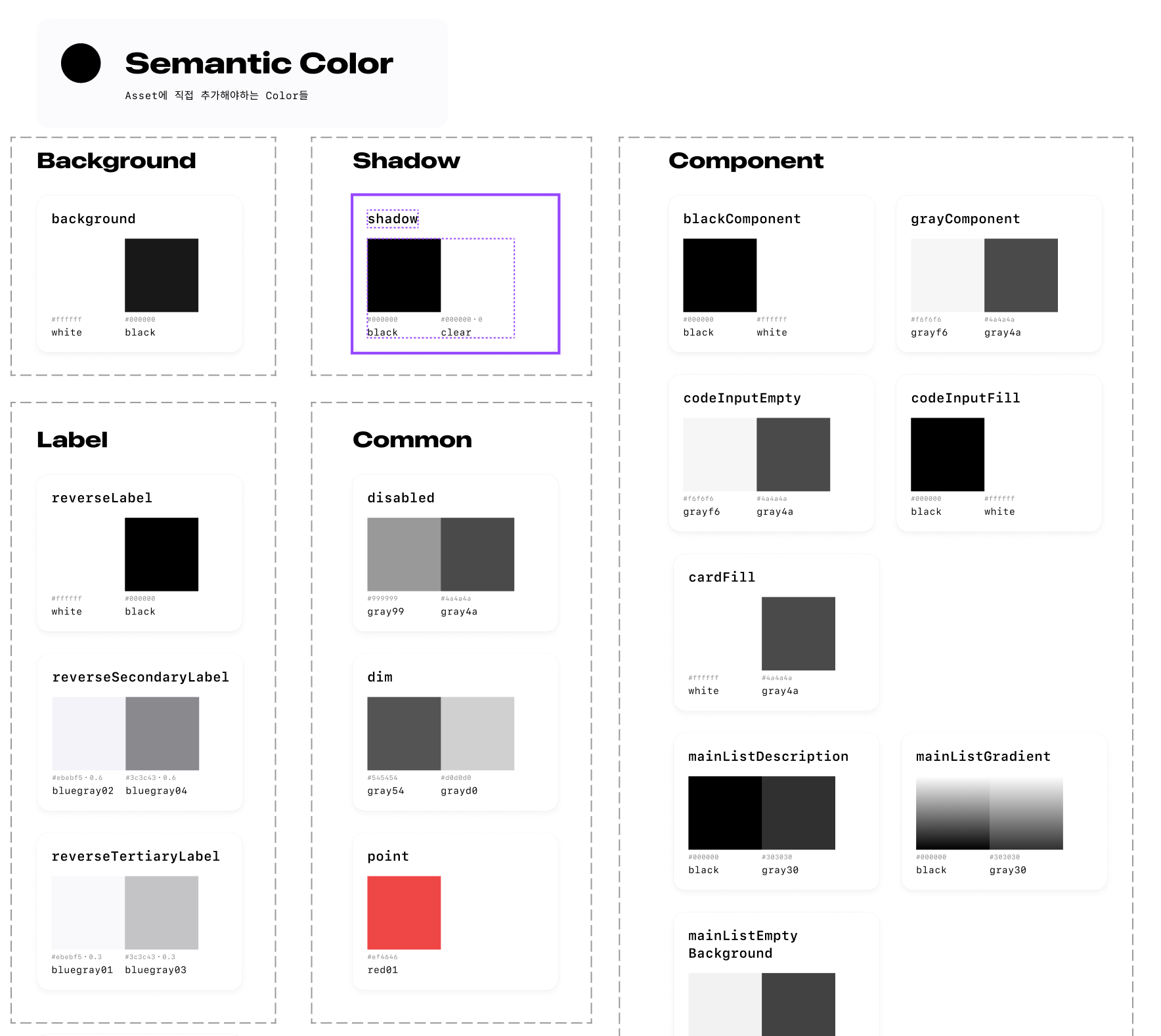 반면에 Semantic Color는 사용되는 목적에 따라 네이밍을 한 것입니다(background, label, codeInputEmpty, ...).