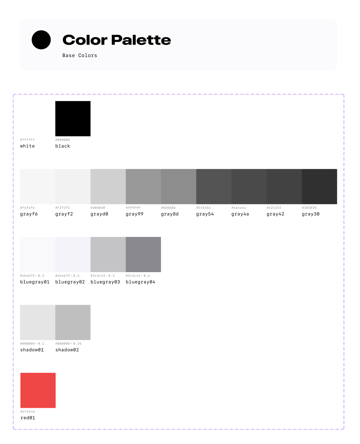 Basic Color는 컬러 팔레트의 개념으로, 그냥 앱에 사용되는 모든 색상을 나열하고 색상과 명도에 따라 그 이름을 정한 것이라고 생각하면 됩니다(grayF6, grayF2, ...).