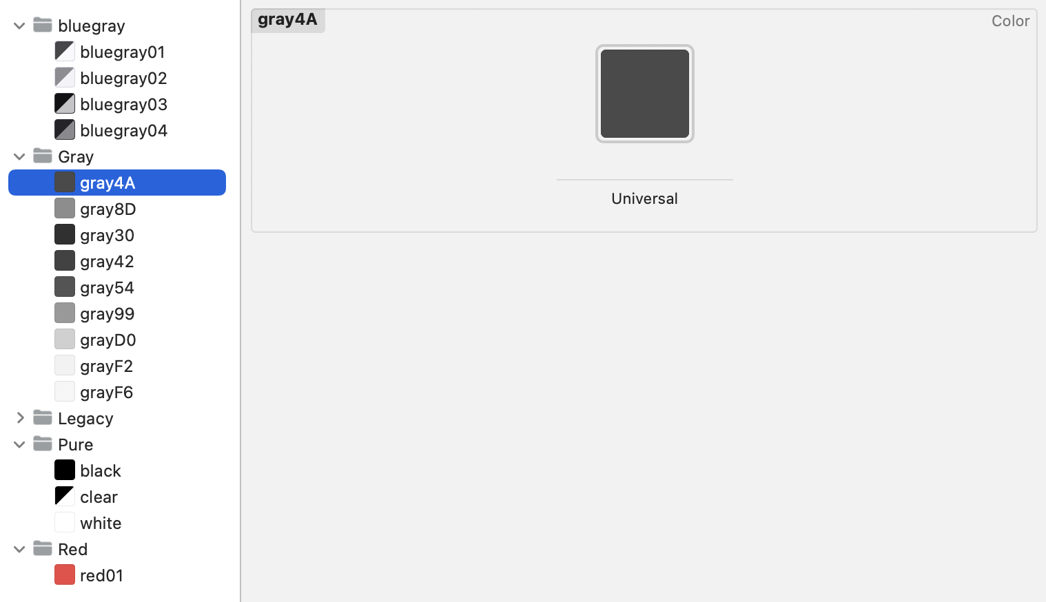 Asset에서 추가하려면 새로운 Color Set을 만들고, light 모드에 white hex 값인 #ffffff를 입력하고 dark 모드에는 gray4A의 hex값인 #4A4A4A를 입력해줘야 하지만,