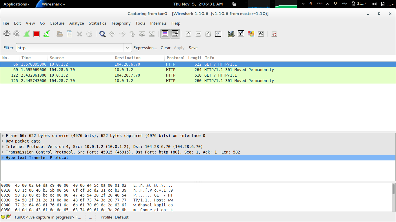 The HTTP/IP packets are decapsulated and sent through tun0.