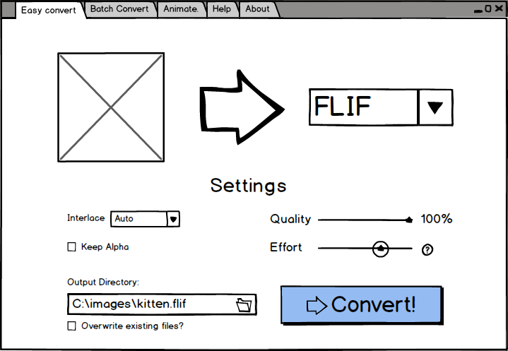 These are the current mockups, however they are subject to change and discussion. Create a Github issue if you would like to contribute to the design of FLIF Desktop.