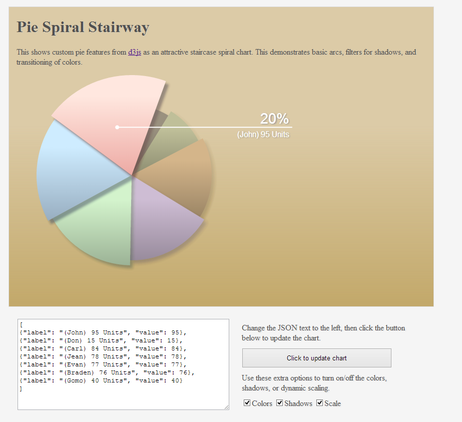 This shows custom pie features from d3js as an attractive staircase spiral chart. This demonstrates basic arcs, filters for shadows, and transitioning of colors.