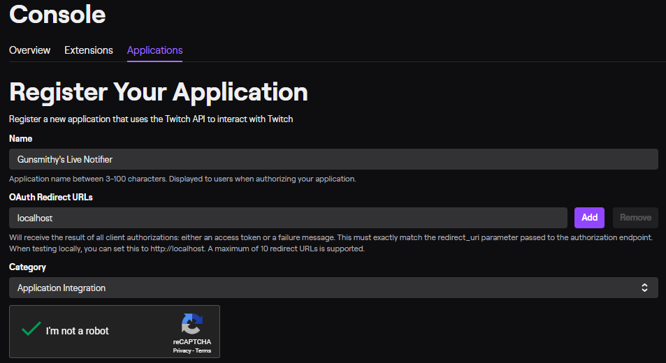 If you do not have the above ID and Secret, go to the Twitch Developers console, log in, and register an application.