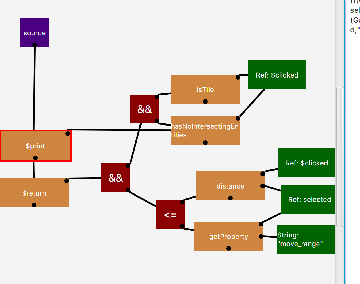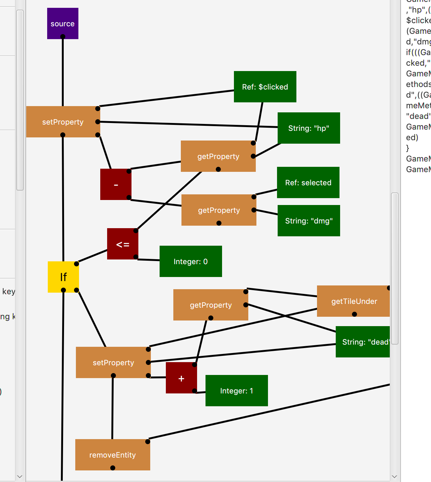 The nodes also contain a script that gets executed when the game transitions to that node. For example, at state b, we must declare a variable selected as the clicked entity. Variables can be declared with $ block on the literal section. All variables are global!
