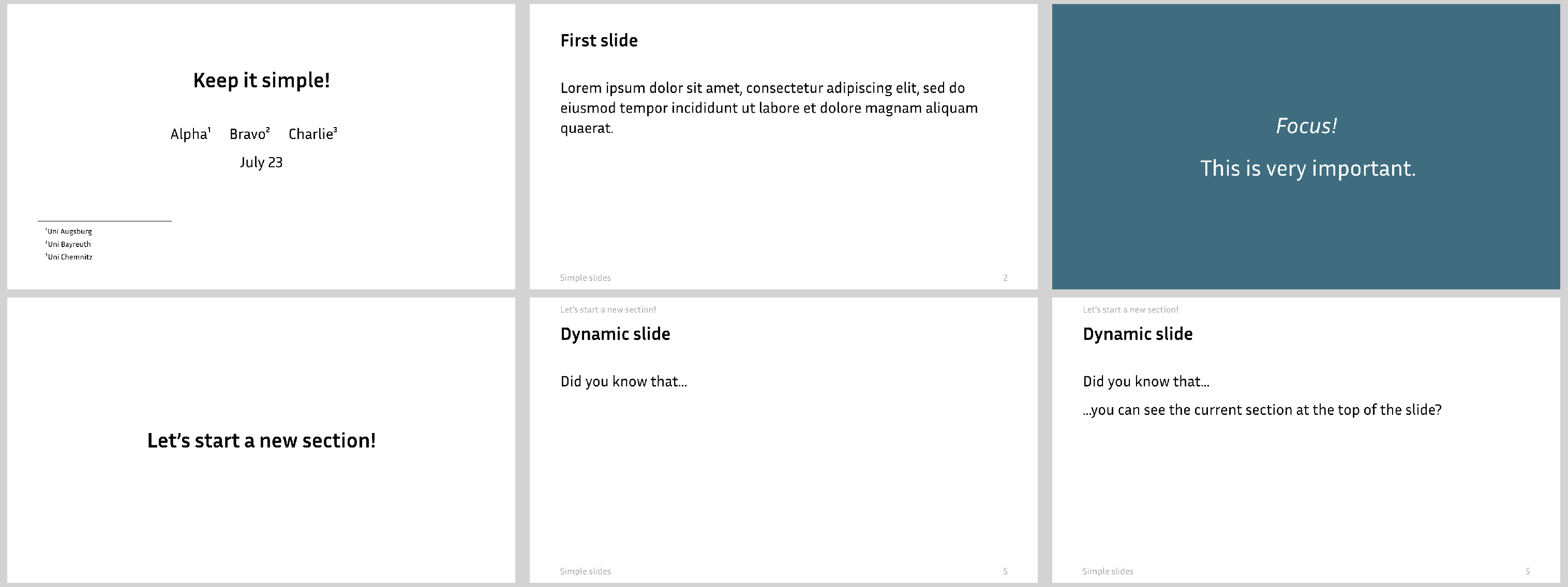 As you can see, a theme can introduce its own types of slides (here: title-slide, slide, focus-slide, centered-slide) to let you quickly switch between different layouts. The book has more infos on how to use (and create your own) themes.