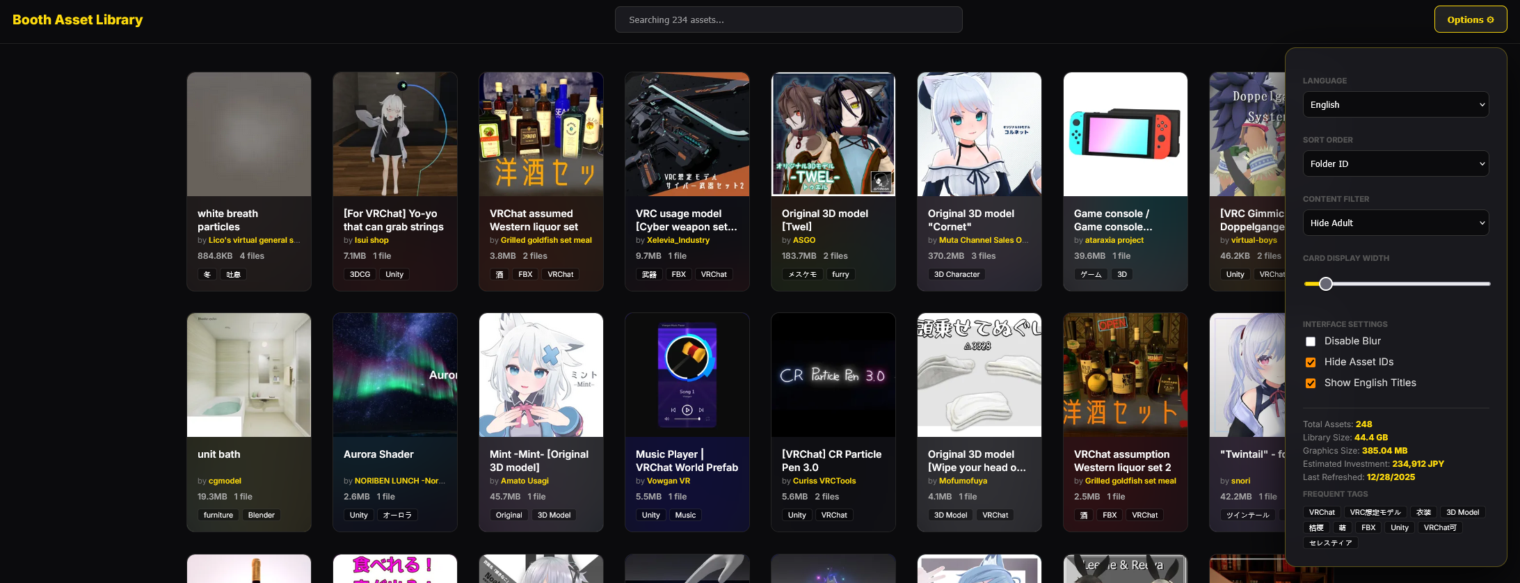 A high-performance local web gallery generator for your BoothDownloader library. Organize, search, and preview your VRChat assets and Booth items with a modern, responsive interface.