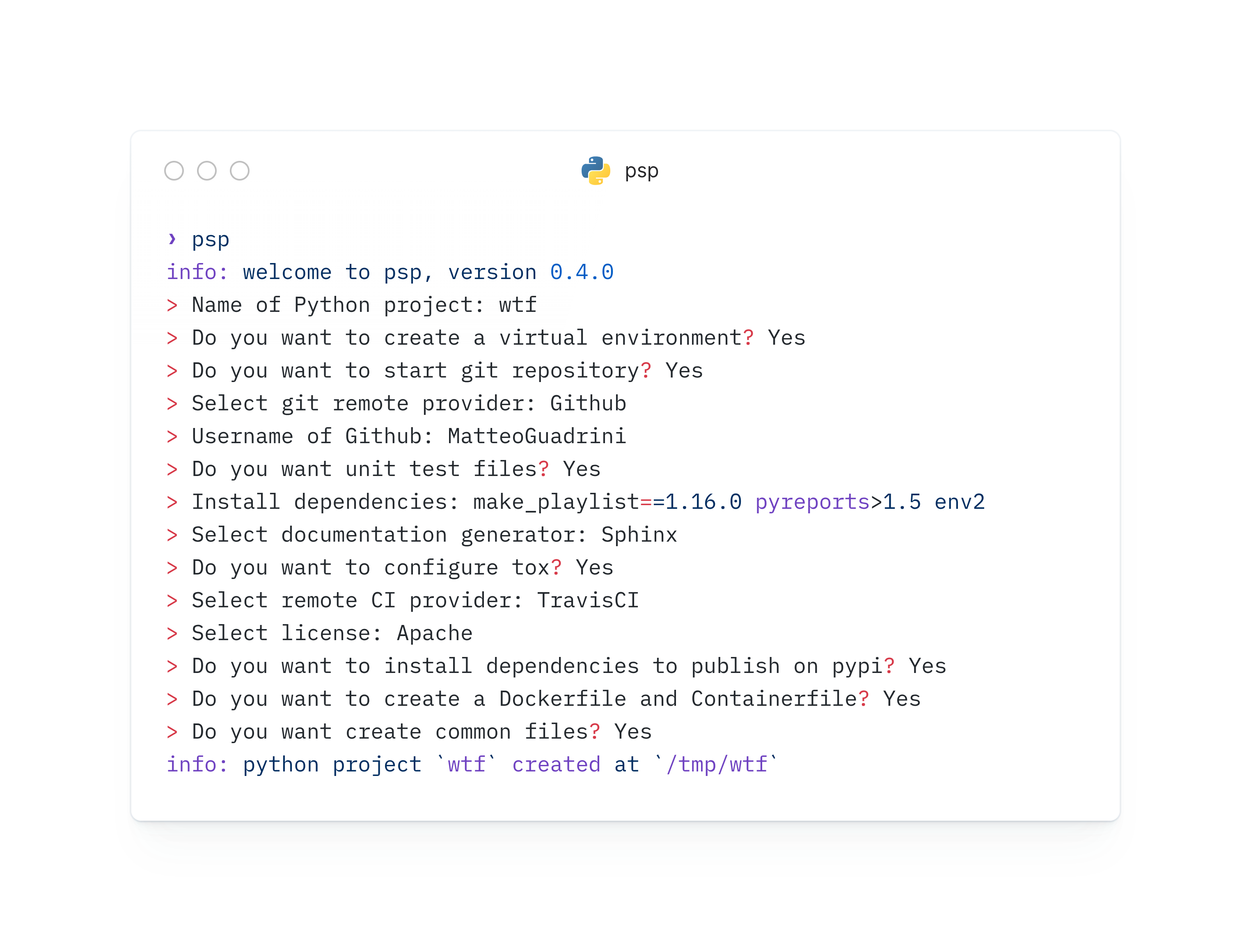 psp is a blazing fast command line utility to scaffold your Python project, written in Rust.