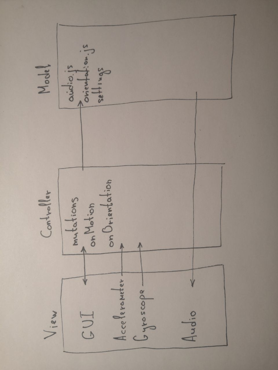 The application uses an MVC-like architecture (meaning MVC on the client), where the model uses a mutable state instead of the database, and the View will refer not only to the GUI, but also the data from the gyroscope and accelerometer, as well as the synthesized sound. The most important parts of the business logic are in audio.js, motion.js, and orientation.js. The state and almost all of its control is in settings.js. The settings object contains the entire state of the application. Changes to this object are made through methods of the mutations object. The connection between the view (its UI part) and the state is made in the settingsInit() function. This object is written to localStorage. Each mutation of it causes an update of localStorage. The settings object, with the exception of the settings.ui property, completely defines the sound of the system. The Import / Export buttons allow you to manipulate the state as an external JSON file.