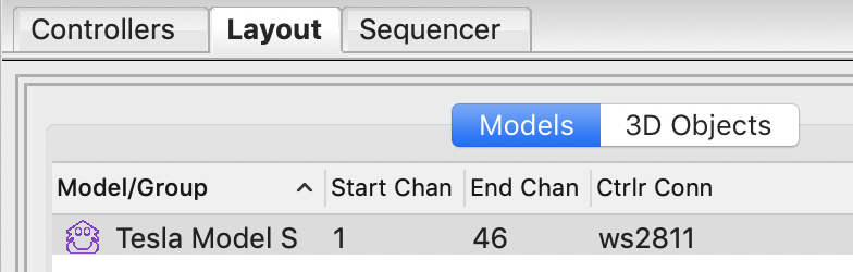 Select the Layout tab to view the Tesla 3D vehicle model. You should see the Tesla Model S model listed under the Model/Group table.