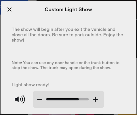 As the custom light show loads, the status at the bottom of the popup cycles through "Loading lightshow.fseq" and "Loading light show...". When the status becomes "Light show ready!", you can exit the vehicle and the custom show will start.