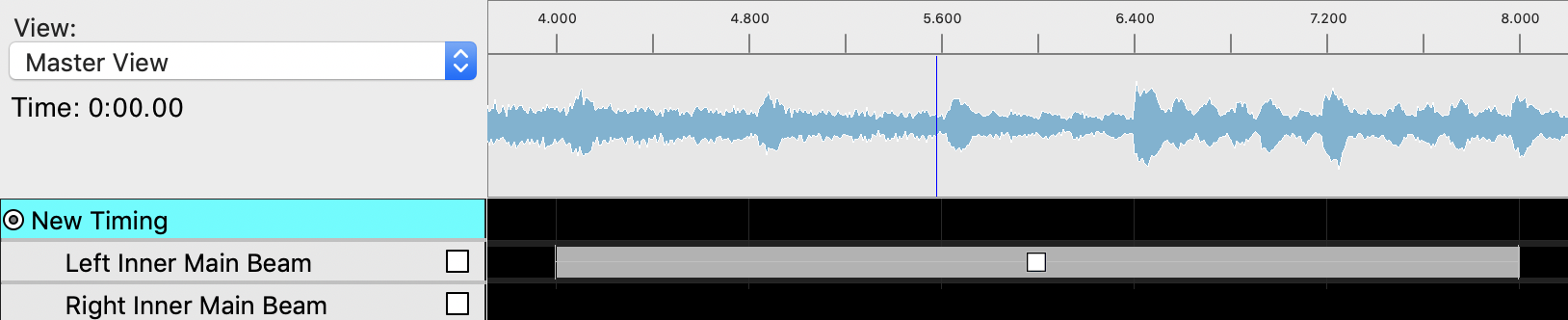 Left inner main beam, 70% brightness, effect duration 1s: causes the light to ramp from 0% to 50% intensity over 1s, then instantly turn off (because an empty xLights timeline corresponds to 0% brightness).