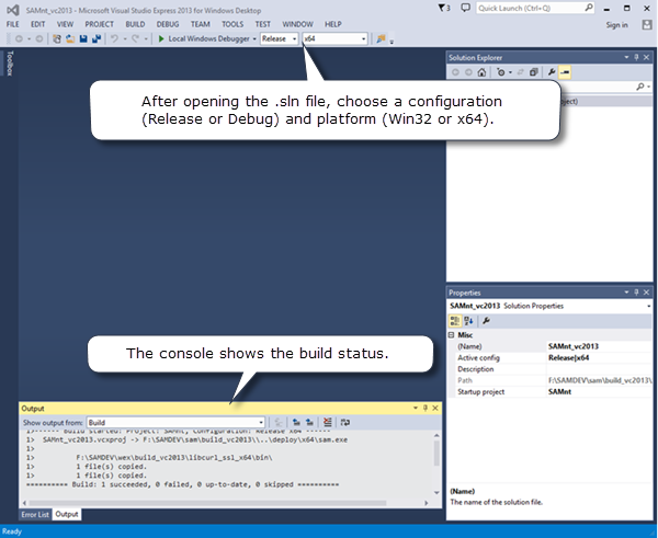 The instructions below are for building SAM with Microsoft Visual Studio 2013 Express for Windows Desktop with Update 5 (VS 2013 Express), which was required to build SAM for Windows when we originally released the open source project and before we updated it to work with Visual Studio 2017. Visual Studio 2013 Express is an older version of Microsoft's free integrated development environment (IDE).