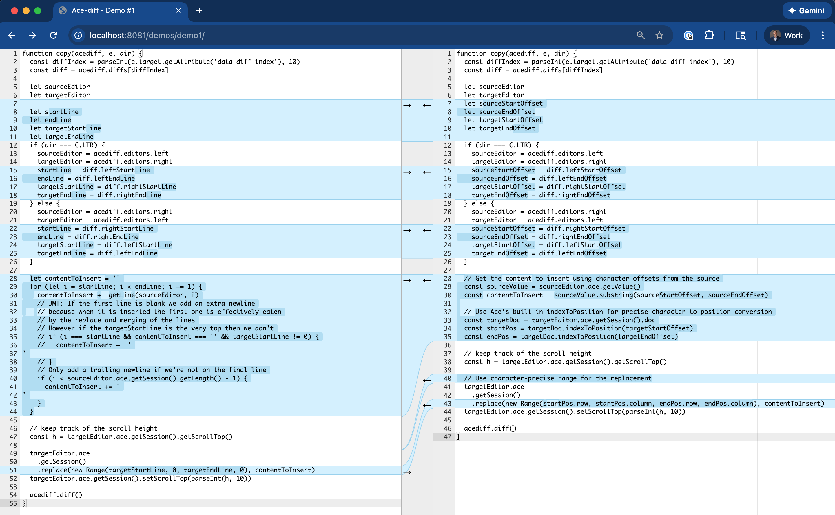 }ace(object, optional, default:window.ace). The Ace Editor instance to use.element(string or element object, required). The element used for Ace-diffmode(string, optional). this is the mode for the Ace Editor, e.g."ace/mode/javascript". Check out the Ace docs for that. This setting will be applied to both editors. I figured 99.999999% of the time you're going to want the same mode for both of them so you can just set it once here. If you're a mad genius and want to have different modes for each side, (a) whoah man, what's your use-case?, and (b) you can override this setting in one of the settings below. Read on.theme(string, optional). This lets you set the theme for both editors.diffGranularity(string, optional, default:broad). this has two options (specific, andbroad). Basically this determines how aggressively AceDiff combines diffs to simplify the interface. I found that often it's a judgement call as to whether multiple diffs on one side should be grouped. This setting provides a little control over it.showDiffs(boolean, optional, default:true). Whether or not the diffs are enabled. This basically turns everything off.showConnectors(boolean, optional, default:true). Whether or not the gutter in the middle show show connectors visualizing where the left and right changes map to one another.maxDiffs(integer, optional, default:5000). This was added a safety precaution. For really massive files with vast numbers of diffs, it's possible the Ace instances or AceDiff will become too laggy. This simply disables the diffing altogether once you hit a certain number of diffs.left/right. this object contains settings specific to the leftmost editor.left.content / right.content(string, optional, default:null). If you like, when you instantiate AceDiff you can include the content that should appear in the leftmost editor via this property.left.mode / right.mode(string, optional, defaults to whatever you entered inmode). This lets you override the default Ace Editor mode specified inmode.left.theme / right.theme(string, optional, defaults to whatever you entered intheme). This lets you override the default Ace Editor theme specified intheme.left.editable / right.editable(boolean, optional, default:true). Whether the left editor is editable or not.left.copyLinkEnabled / right.copyLinkEnabled(boolean, optional, default:true). Whether the copy to right/left arrows should appear.