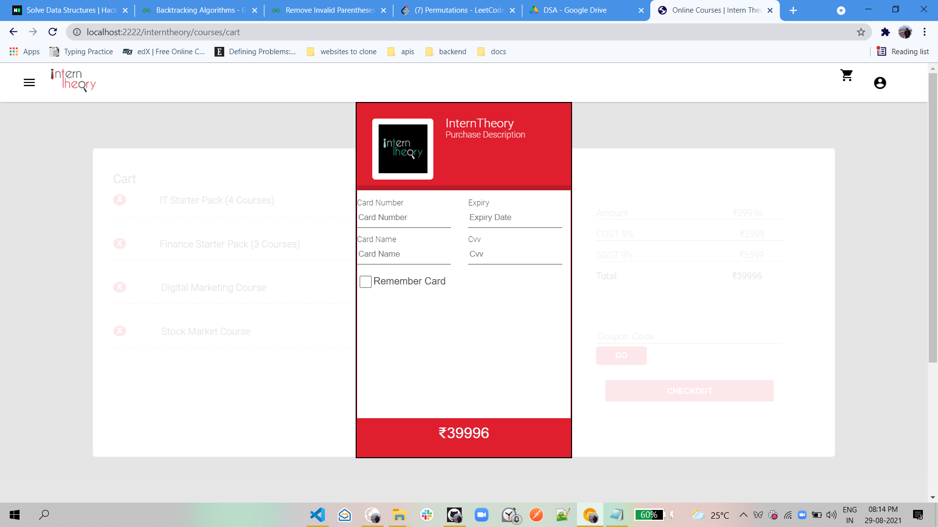 Cart page contains all the courses that we have selected on the courses page and payment and checkout follow.
