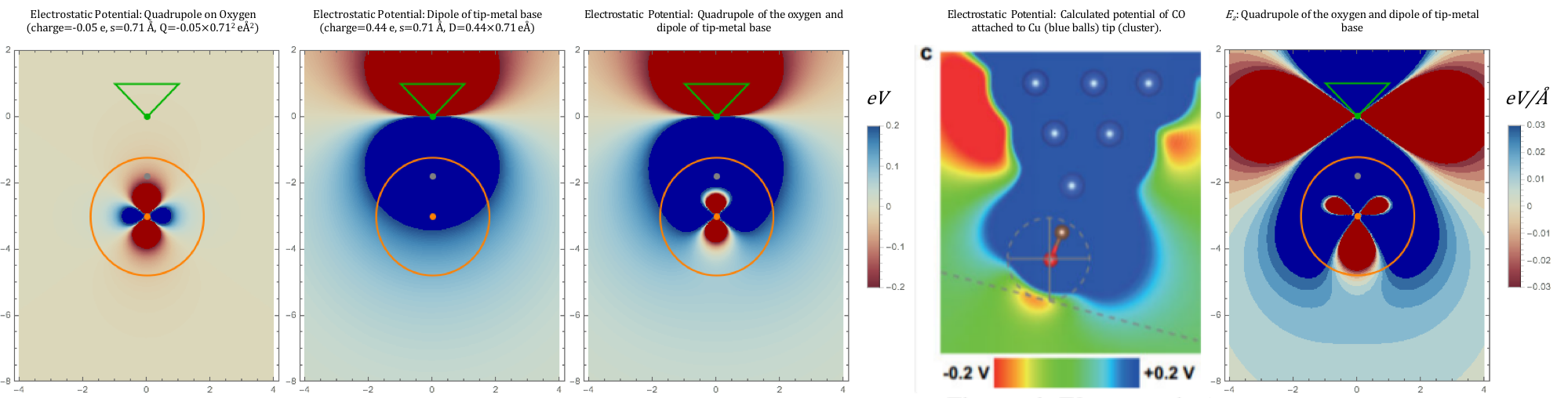 Image illustrating electrostatic field around CO-tip - from left to right (1-3 and 5 are analytical models) 1) Electrostatic potential around quadrupole on oxygen. 2) Potential around dipole of the metallic tip-base. 3) Electrostatic potential of the whole system. 4) DFT calculated potential around CO-tip on metallic cluster, taken from Supplementary Information of Nat. Commun. 9, 122 (2018). 5) z-component of the electric field around the whole (CO-tip + metallic tip-base) system. Green point (at the corner of triangle) depicts the last atom of the metallic tip-base, while gray and orange points illustrates positions of carbon and oxygen, respectively. The orange circle represents van der Waals radius of the oxygen atom