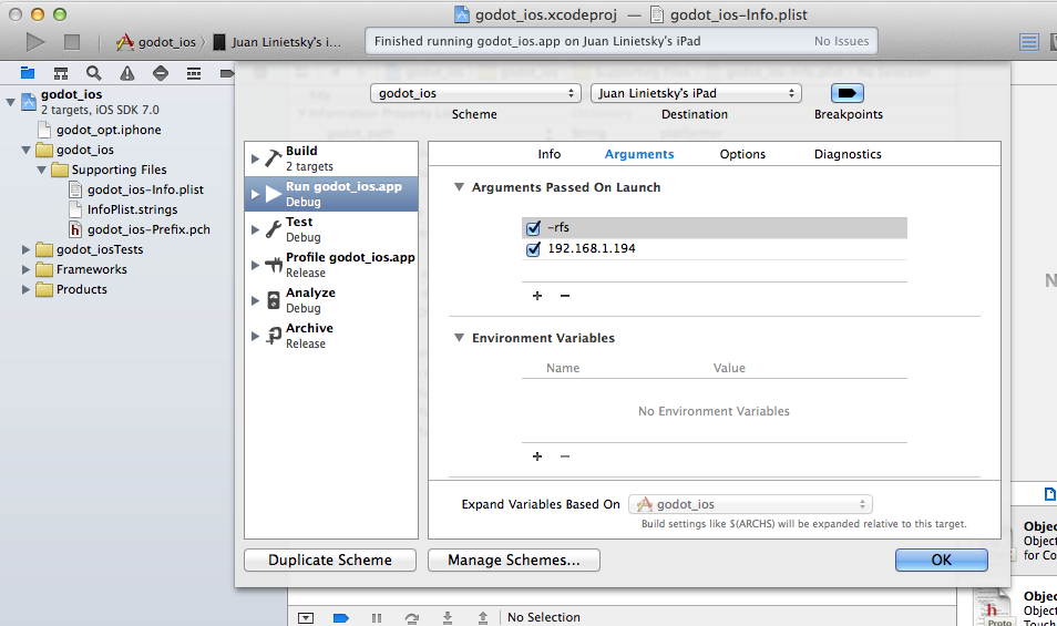 On XCode, click on your app name (top left, next to the "Stop" button), and select "Edit Scheme". Go to the "Arguments" tab, and add 2 arguments, "-rfs" and the IP of your PC.