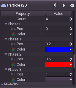 Particles can use up to 4 color phases. Each color phase can include transparency. Phases must provide an offset value from 0 to 1, and alays in ascending order. For example, a color will begin at offset 0 and end in offset 1, but 4 colors might use diferent offsets, such as 0, 0.2, 0.8 and 1.0 for the different phases: