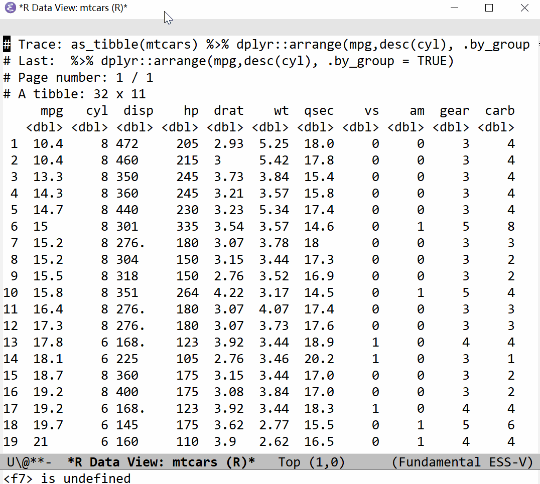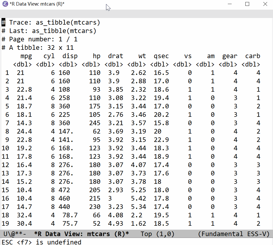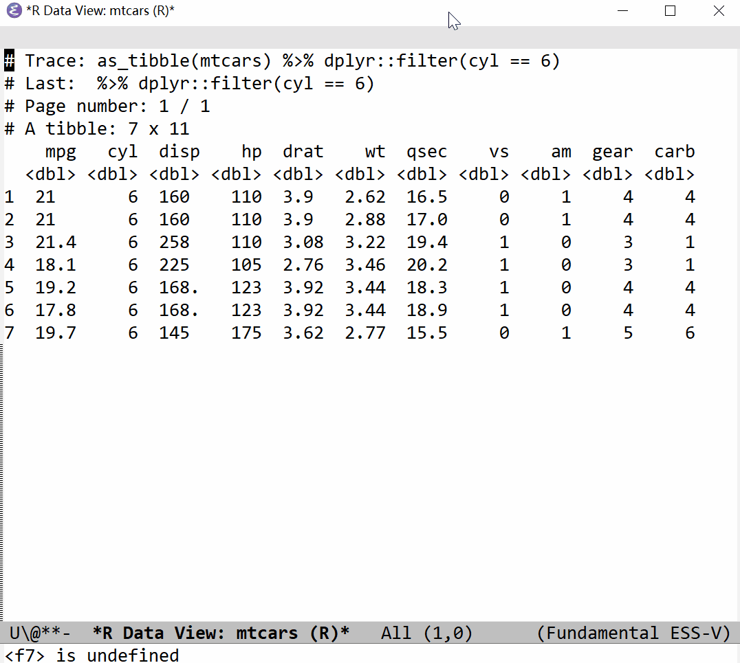 (require 'ess-view-data)Call ess-view-data-print, select a object whichever can be convert to a tibble or data.table depending on the backend, and then a buffer will pop up with data listed/printed. Further verbs can be done, like filter, select/unselect, mutate, group/ungroup, count, unique, summarise, and etc. It can be reset (ess-view-data-reset) any time.