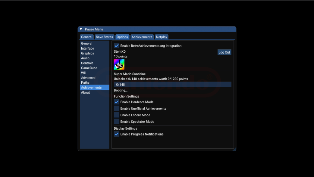 | Achievements | Enable Hardcore Mode · Enable Unofficial Achievements · Progress Notifications · RetroAchievements Integration (Login, Spectator Mode, etc.) |