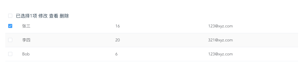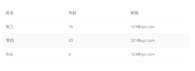 headerList: [ {label:"头像",type:"image",prop:"avatar"}, { label: '姓名', prop: 'name' }, { label: '年龄', prop: 'age' }, { label: '邮箱', prop: 'email' }, // time { label: '时间', type: 'time',format:"",prop:"addTime"}, { label: '大小', type: 'size',prop:"docSize"}, ], tableData: [ { name: '张三', age: 16, email: '[email protected]', docSize:13435, addTime:1587695391141, avator:"https://picsum.photos/200/300" }, { name: '李四', age: 20, email: '[email protected]', docSize:13435, addTime:1587695391141, avator:"https://picsum.photos/200/300" }, { name: 'Bob', age: 6, email: '[email protected]', docSize:13435, addTime:1587695391141, avator:"https://picsum.photos/200/300" } ],