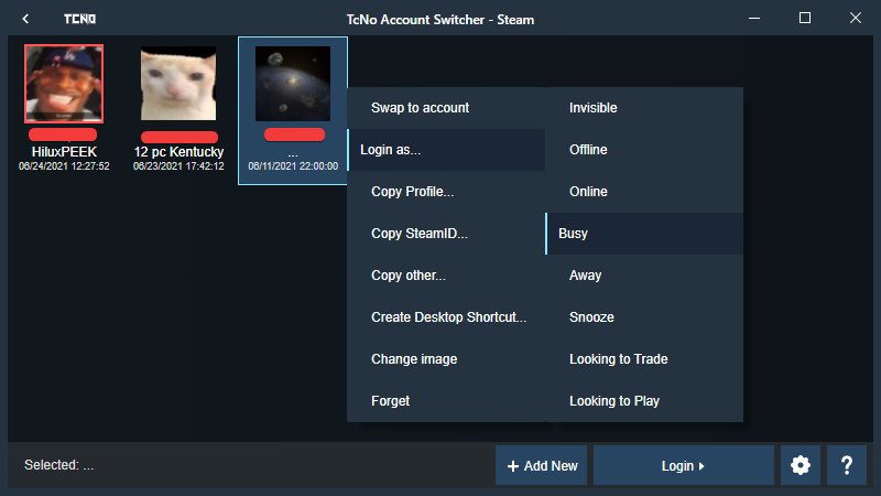 Please report any and all bugs, as well as steps to recreate them into the Issues section, or the #bug-report channel under TCNO ACCOUNT SWITCHER section on the Community Discord.