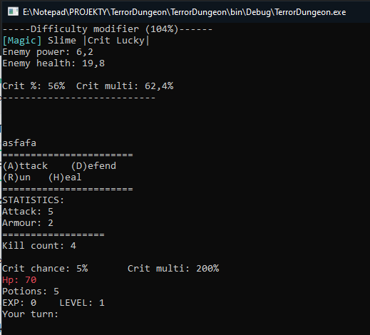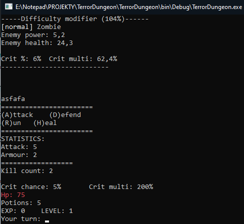 This is my first ever fun little learning project from 2021 for C# and game design in general. "TerrorDungeon" - small, rpg, dungeon crawler console game.